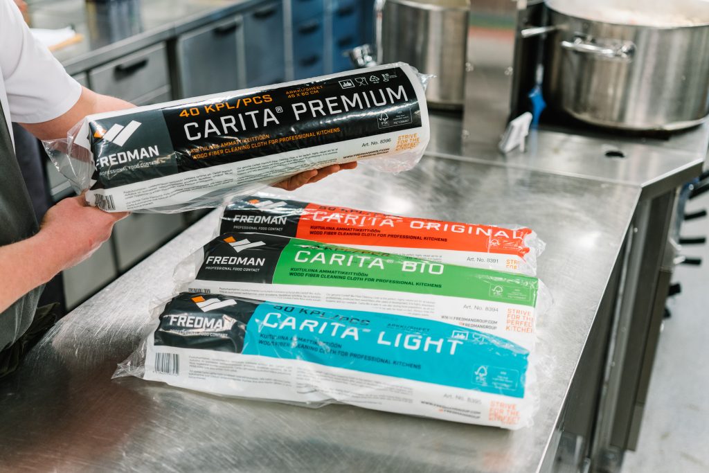 Fredman Carita-liina on ammattikeittiöiden luottotuote, jota arvostetaan erityisesti sen monikäyttöisyyden, elintarviketurvallisuuden, imukyvyn ja kestävyyden vuoksi. Carita-liinat ovat käyneet ulkopuolisen asiantuntijakäsittelyn ja allergiatunnus kertoo, että tuote täyttää tarkat allergiakriteerit.